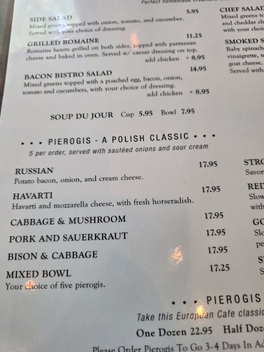 Baby spinach tossed in our house-made raspberry vinaigrette, topped with smoked salmon, poached egg, goat cheese, pears, onion and candied pecans. Served with 2 fried havarti pierogis.